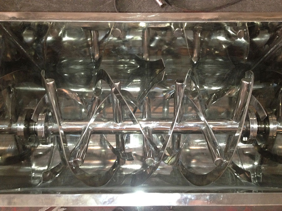 外螺旋帶盤繞形式配合旋轉方向把物料從兩端向中間推動,而內螺旋帶把物料從中間向兩端推動,形成對流混合,整個內外螺帶依附軸轉動形成翻滾運動,達到三維式的攪拌混合效果,物料在相對短的時間混合均勻。設備應用于干粉,顆粒,少量液體與低粘度的漿料。