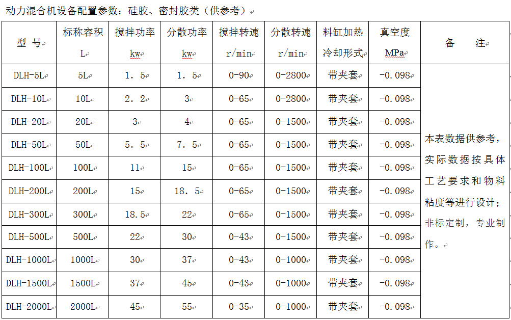 九、MS密封膠行星動力混合機|真空攪拌機配置參數表:(常規的容量、功率、轉速等數據表,其它更大容積的未作描寫)